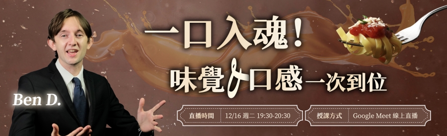 這場直播和Ben一起突破形容詞瓶頸,讓你用 道地又生動的英文 說出真正的「美味」!