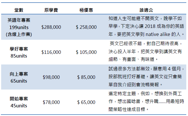 每年年底世界公民文化中心都會推出【我的英語年】年度學習方案,參加英語年,不只是享學費優惠,也是對自已未來一年的承諾,承諾會產生動力,我們和學員一起努力,完成你為自己訂下的年度目標,以下方案,你先自我評估哪一個方案最適合你,專業老師會根據你的程度及目標給精確的建議: