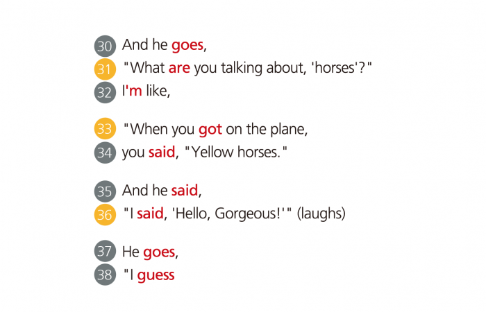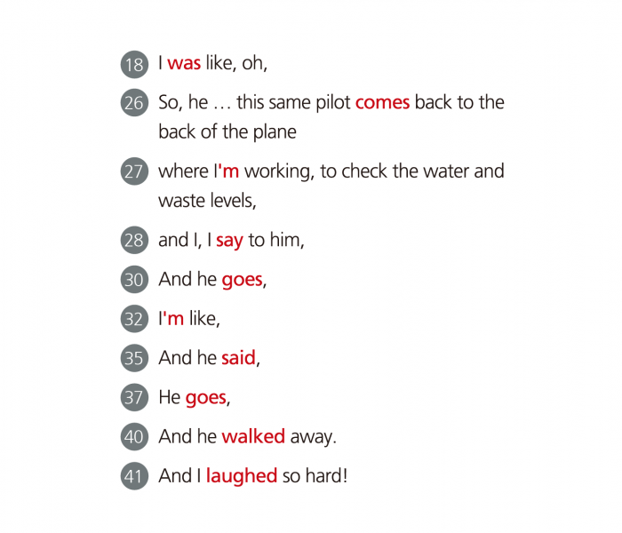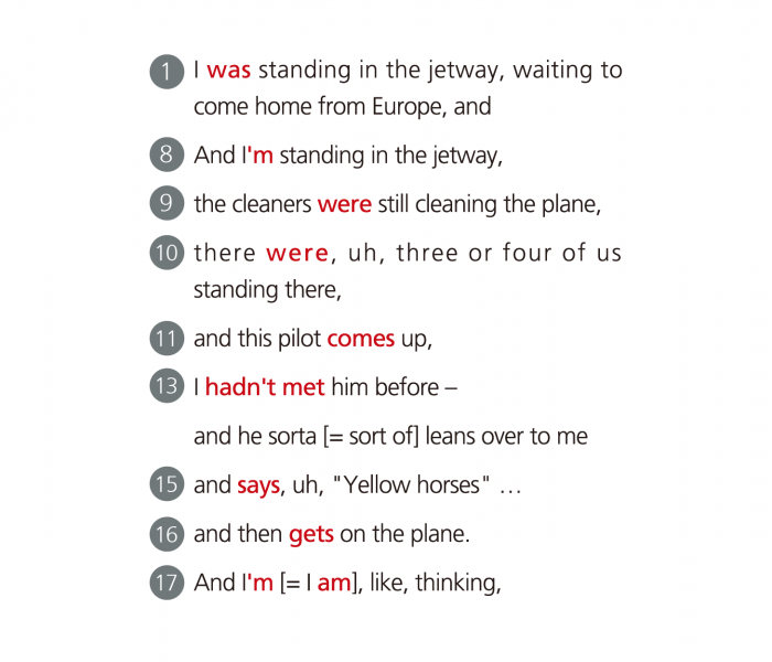 [4] 請參考:Wolfson N. The conversational historical present. In: Linx, n°20, 1989. Analyse grammaticale des corpus oraux. pp. 135-151; doi : https://doi.org/10.3406/linx.1989.1125