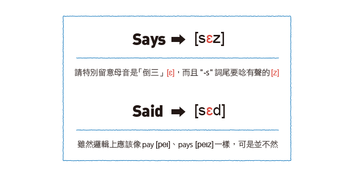 還有另外一個偶而會聽到的特別用法。英語裡說故 事時,不但常變換時態,有時「人稱」上也有例外 用法,有的人除了說 "I say" 和 "I said",有時還會說 "I says"。這個似乎原先來自愛爾蘭地區的用法,並 不算標準,而且幾乎只有在講故事時才會出現 ,筆 者記得小時候聽姐姐的某位朋友常用,當時想,她 的這個用法,到底表示她教育程度不好,還是只是 流行好玩?後來注意到,故事講得正開心時,自己 偶爾也會用。