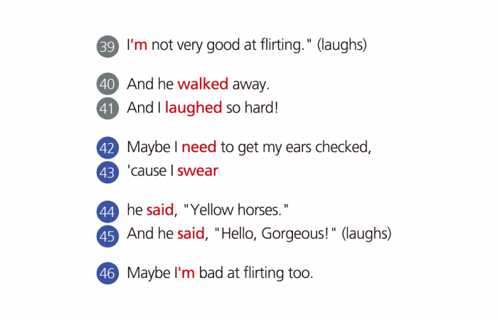 >再來是講述者Betty在錄音時直接跟聽眾講話的部分,也不算在裡面,因為這些話不屬於故事本身,而是她講故事當下所發表的意見、評語、結論等,包括: 3 4 5 7 42 43 44 45 46