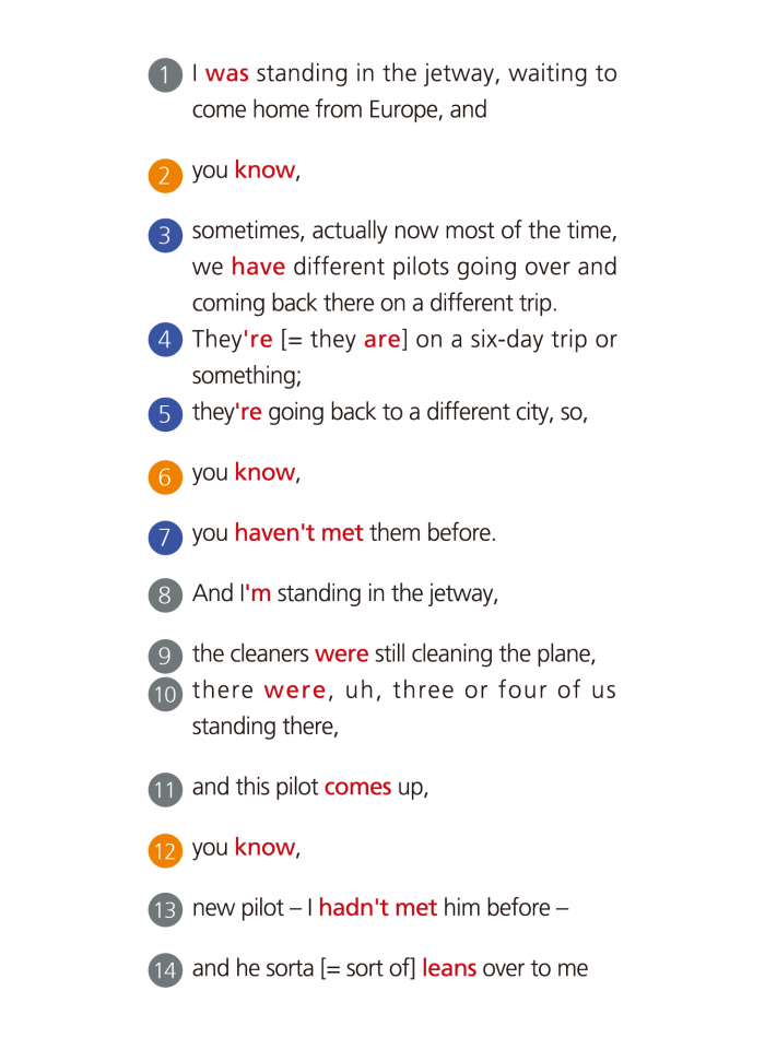 "Betty" 是空服人員,平時蒐集工作上觀察到的奇人妙事,錄製成播客,用輕鬆自然、極為口語化的風格來講她生活中小插曲,跟聽眾分享。就一般英語母語者互相講故事風格來說,這個播客很有代表性。Betty在下面的故事中講述她和之前沒見過的飛機駕駛員談話時所發生的小誤會,相當搞笑。