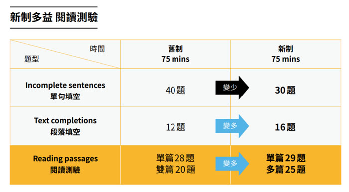台灣從 2018 年 3 月開始實行新制多益,從聽力的口音到閱讀的形式、題數、長度都做了微調,閱讀 變得最有挑戰性的部分就屬多篇閱讀測驗,同樣的時間,要消化更長的文章,所以閱讀速度也變成 一大關鍵。