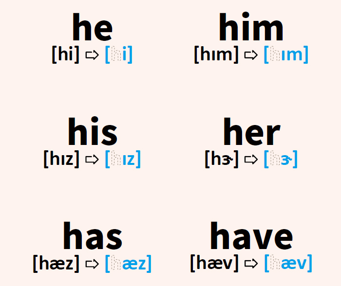 老外為了發音方便,[h]在句子裡經常省略不發音,特別是以下這幾個功能字出現在非句首的位置時: